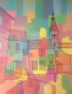 2018No. 1 in de serie houtskool-acryl-olieverf op papier: een straatje in Blesle in Auvergne (n.a.v. een schets uit 1985)